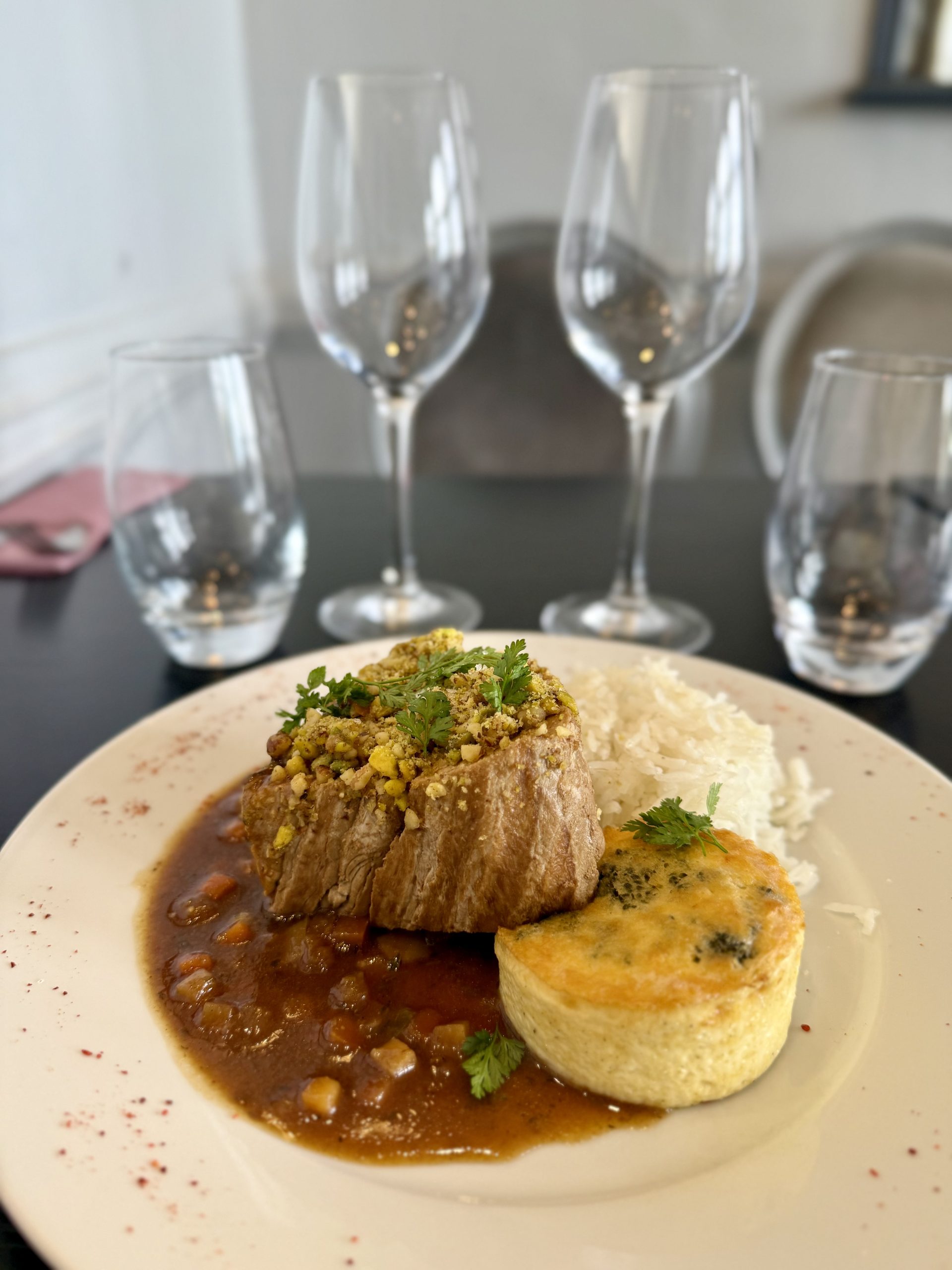 Goujonnettes de lapin farci , sauce à la bière et au pain d’’épice , coco à la tomate